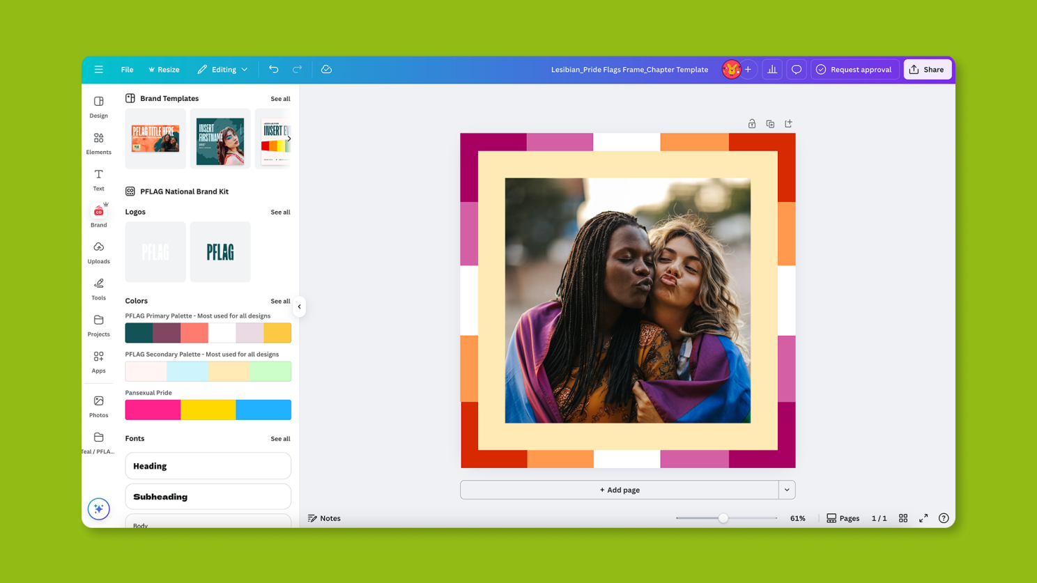 One example of a time when we used Canva to empower social movements is our partnership with the incredible LGBTQIA+ advocacy group, PFLAG National. We used Canva to build flexible branded templates and tools for local chapters across the country.