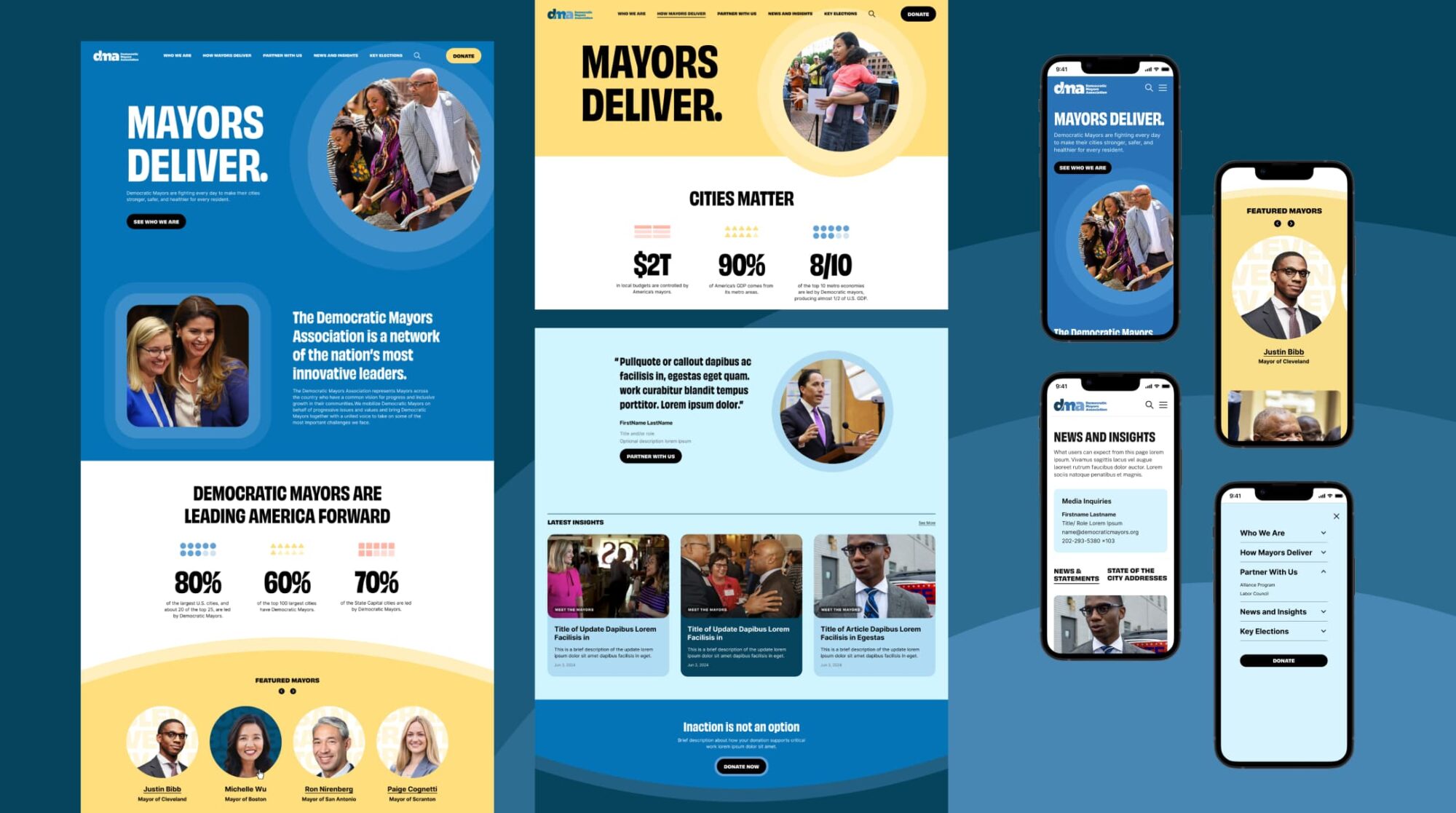 The Democratic Mayors Association (DMA) represents mayors across the country who share a vision for progress, inclusive growth, and innovation in their communities. As the unified voice of Democratic Mayors, DMA mobilizes leaders on behalf of progressive issues and connects them with allies from labor, the private sector, and advocacy organizations. DMA came to us to create a new website that raises the visibility of Democratic Mayors, tells the story of how they are shaping the national policy playbook, and inspires engagement from donors, partners, and mayors themselves.