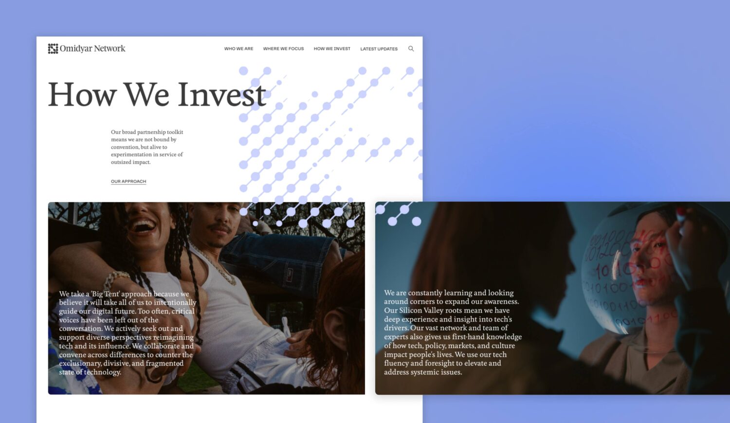 A central element of the rebrand crafted by Omidyar’s brand designers, 20-something, was to visually emphasize the crucial connection between people and technology. They created a pattern generator as part of the brand process, and we worked closely with them to incorporate that pattern generator into the experience of the website.